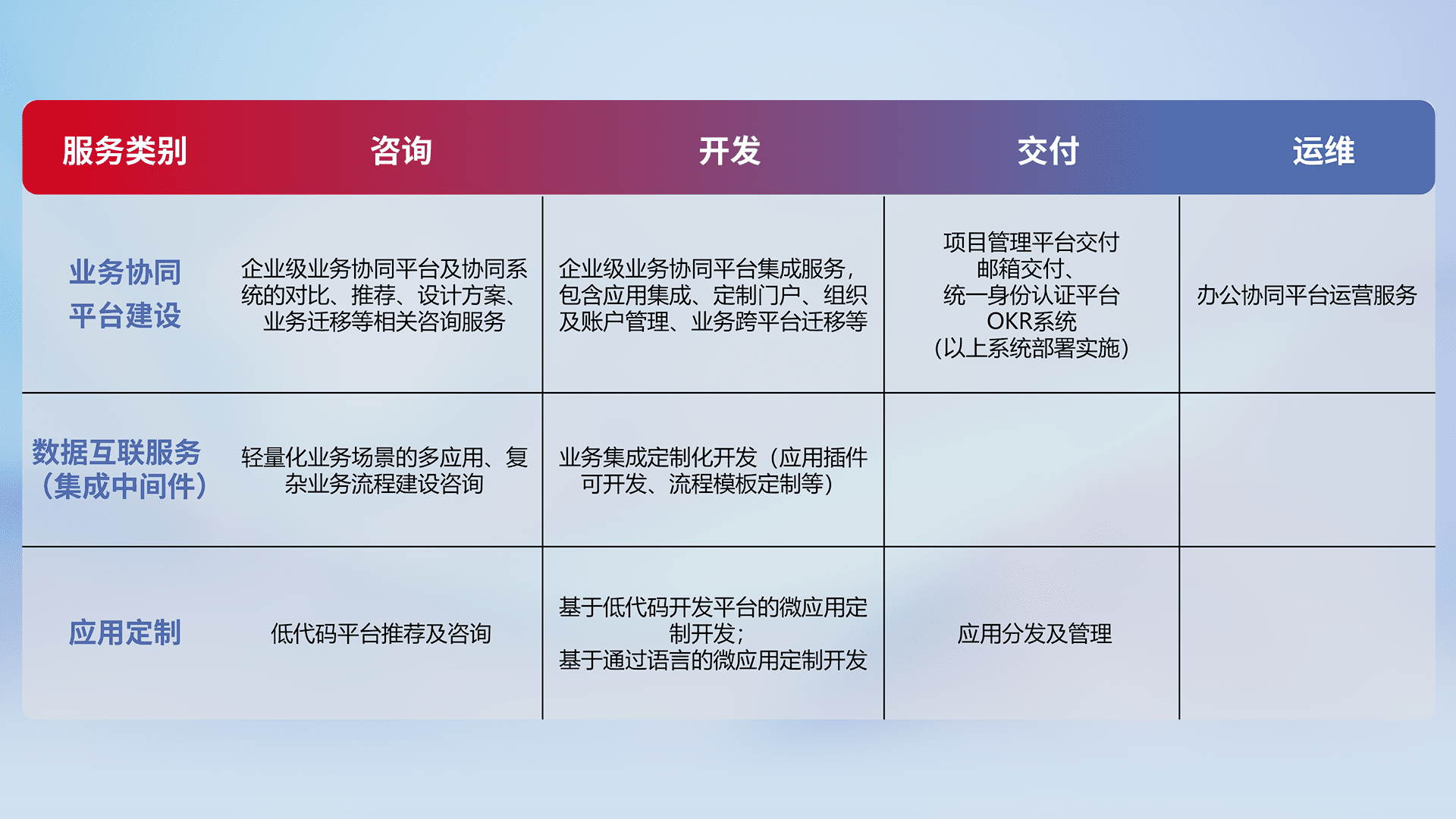 针对钉钉、、企微、、、、IDaas等平台级产品提供产品的规划、、、方案、、、交付、、、定制化开发等服务,,,实现如统一协同办公、、、智能客户服务、、、、混合会议管理、、智能数据查询、、、等业务场景,,实现数字化转型。。。。